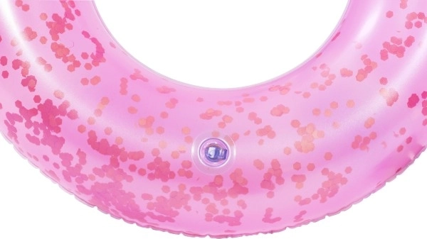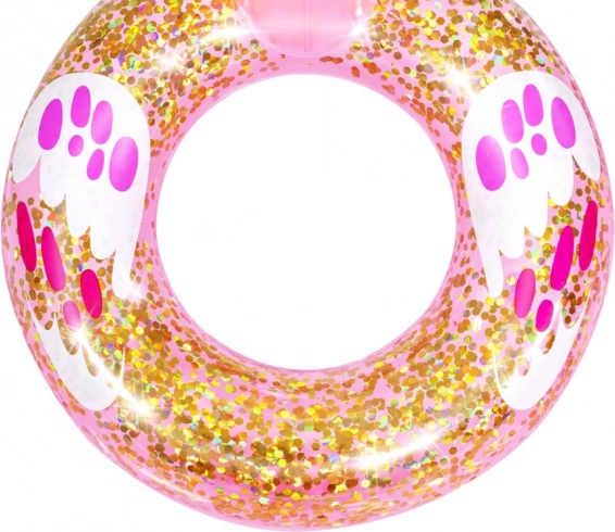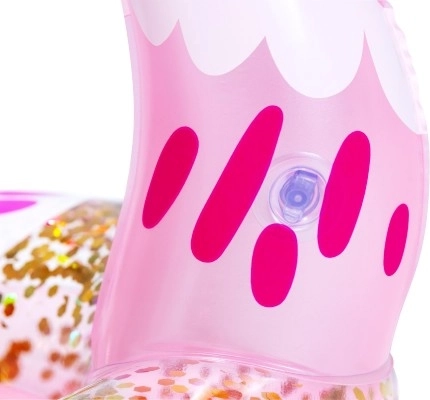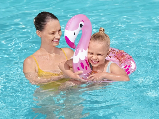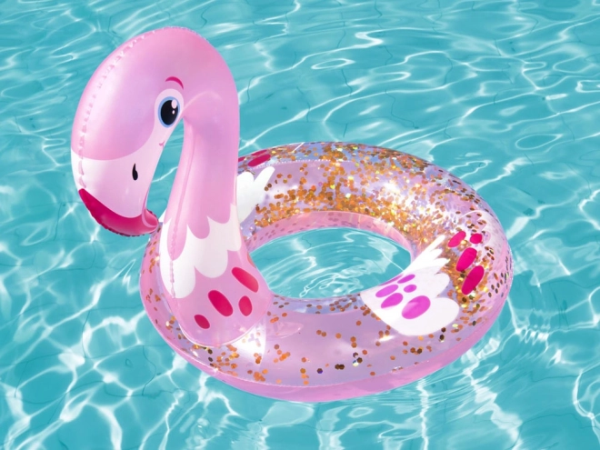 Den oppustelige ring Shimmer N’ Float i lyserød flamingo‑design tiltrækker opmærksomhed med glitrende flager indeni og giver børn sikker støtte, når de pjasker i vandet. Med en diameter på 61 cm er den nem at holde om og ideel til små svømmere.