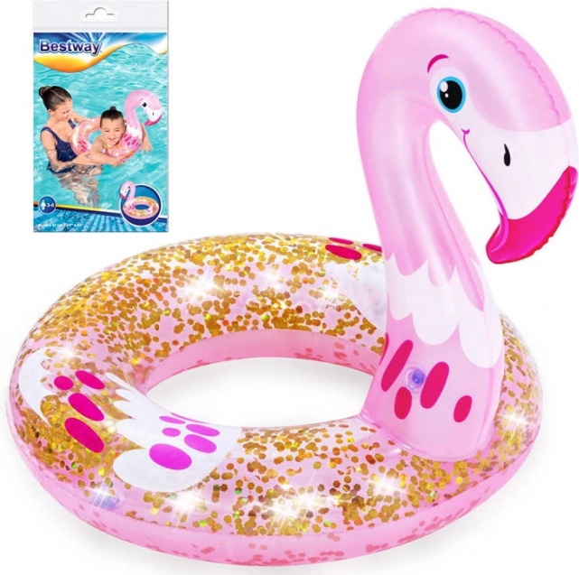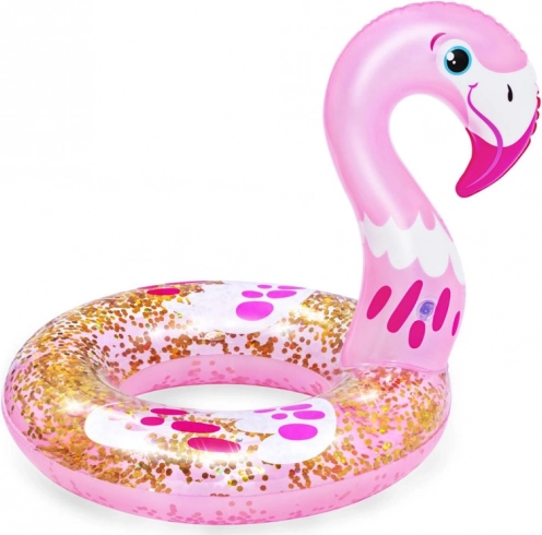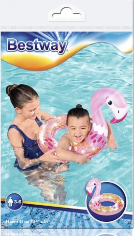 Sødt oppusteligt rundt ligge-/svømmekrud i form af en lyserød flamingo fra Bestway giver masser af vandleg for børn fra 3 til 6 år. Den gennemsigtige del med glitrende brokade glimter smukt i solen, det holdbare PVC‑materiale sikrer lang levetid, og de kompakte mål gør det nemt at tage med til strand og pool.