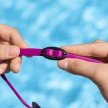 Den hurtigt justerbare silikonestrop og den komfortable næsebro giver en præcis og stabil pasform til forskellige hovedformer. Latexfri og PVC-fri konstruktion er skånsom mod huden og velegnet til regelmæssig brug i svømmehal og åbent vand.