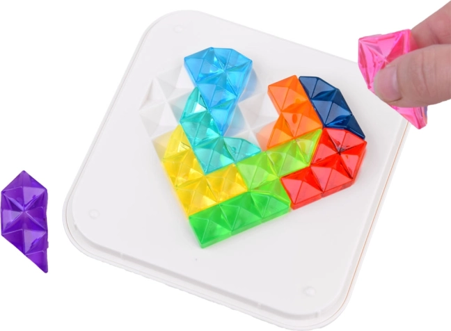 Oplev ubegrænsede muligheder for kreativ skabelse med dette unikke diamantpuslespil. Sættet indeholder 10 farverige plaststykker, der kan samles i forskellige mønstre efter bogen eller din egen fantasi. Brættet har to sider - en med et hjerte og en med en firkant. Alle brikker kan praktisk opbevares i den gennemsigtige boks, hvilket gør det lettere at rydde op og opbevare.