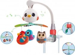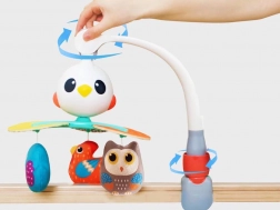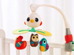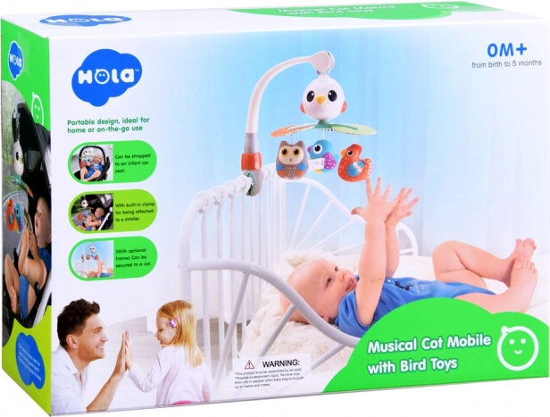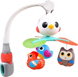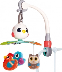 Denne smukke børnemobil er designet til at stimulere dit barns visuelle, auditive og taktile sanser. Velafprøvede sange og behagelige melodier sikrer, at babyen føler sig tilfreds og rolig. Den roterende konstruktion suppleres af farverige fugle som ophængslegetøj, der indbyder til at gribe og røre.