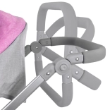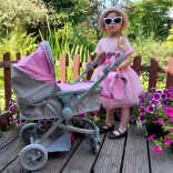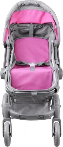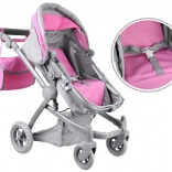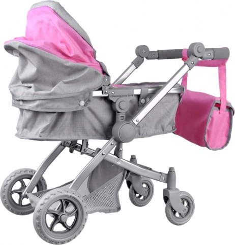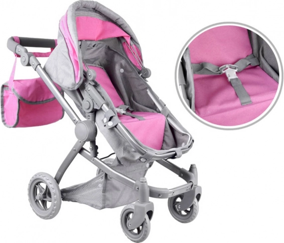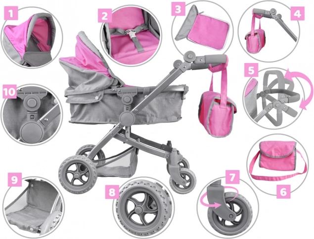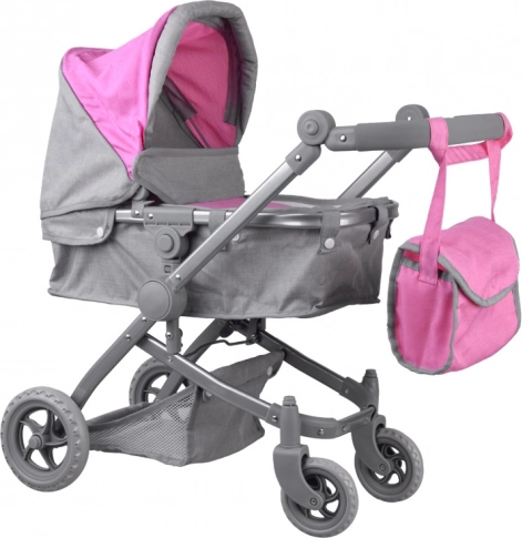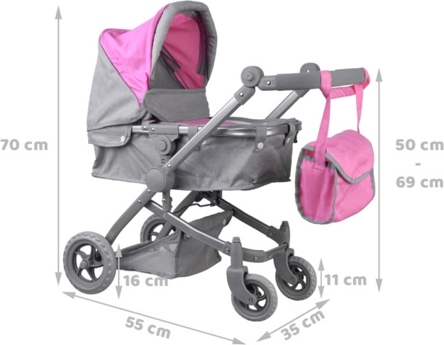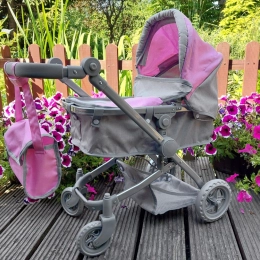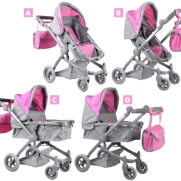 Stilfuld dukkevogn, der kan ombygges til både ligge- og klapvogn, giver børn en realistisk plejeleg. Den har en let ramme, drejelige hjul, justerbart håndtag og sikkerhedsseler. En praktisk taske til tilbehør er inkluderet.
