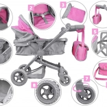 For maksimal legekomfort er der en justerbar lift, vendbart håndtag foran/bagpå og en klapbar kaleche. To forreste drejehjul og massive EVA-hjul giver en glidende kørsel både inde og ude. I den rumlige kurv og den medfølgende taske kan du opbevare alt tilbehør til dukken.