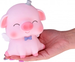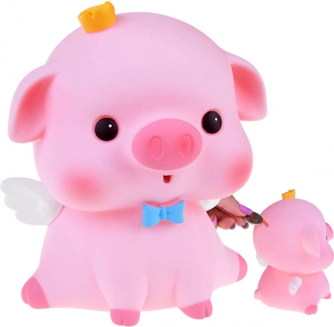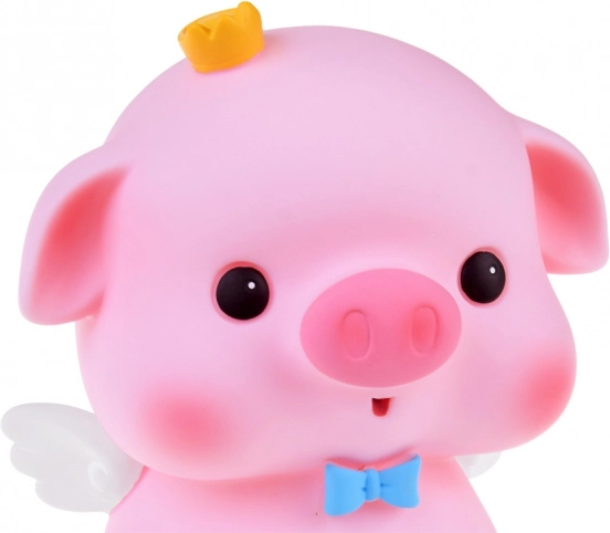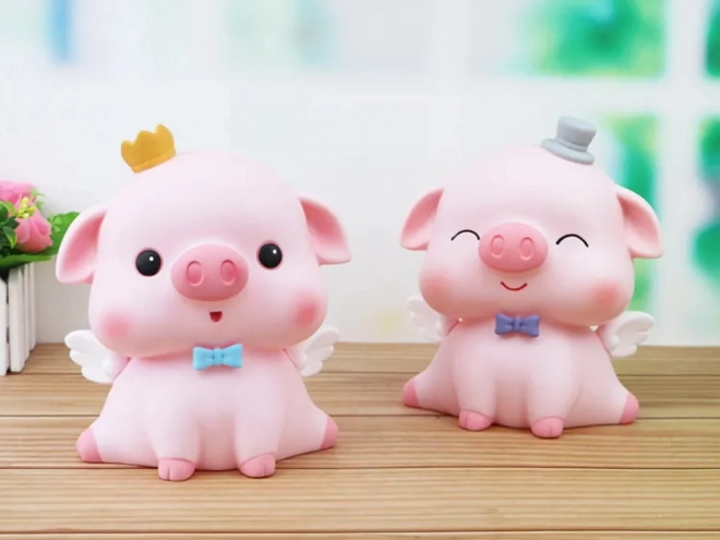 Den lyserøde sparegris med hvide vinger, blå butterfly og gul krone fremkalder et smil og er samtidig en stilfuld dekoration til børneværelset eller skrivebordet.