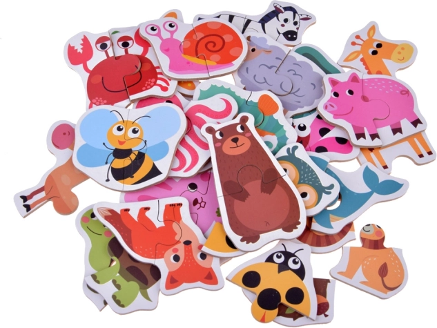 Dette farverige sæt indeholder søde illustrationer af dyr fra safari, skov, gård, eng og vand. Hvert motiv består af to større brikker, som er nemme for børn at holde og samle. Takket være den enkle idé får børn hurtigt selvtillid og glæde ved succes.
