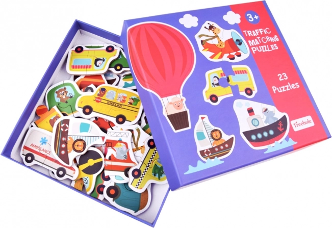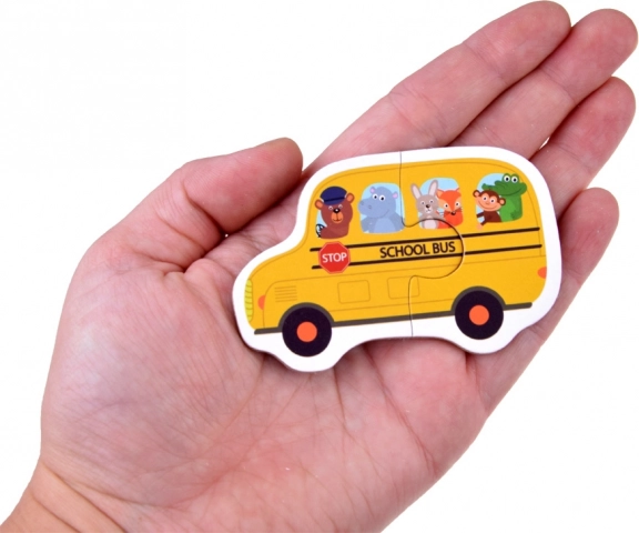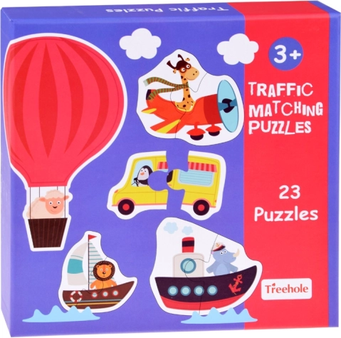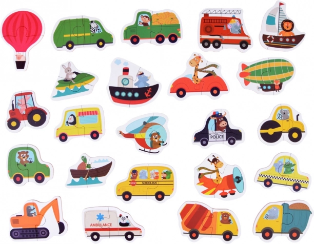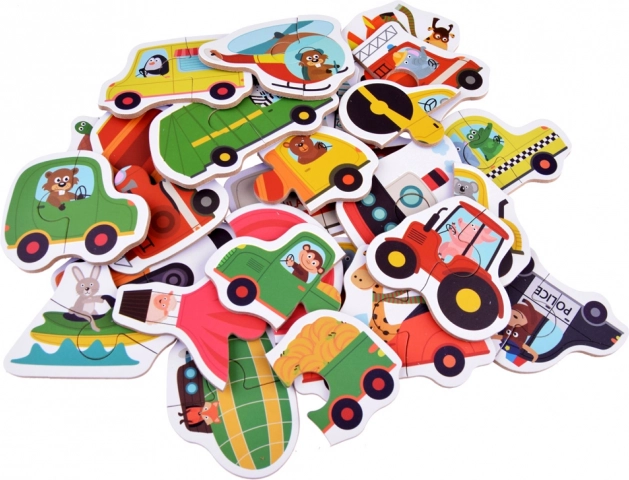 Dette kreative sæt indeholder 23 enkle puslespil i to dele med glade illustrationer fra transportens verden – fra biler og byggemaskiner over politi og brandvæsen til fly, skibe og ballon. Ideelt som det første puslespil for små opdagere, der træner hånd-øje-koordination og genkendelse af former, farver og typer af køretøjer.