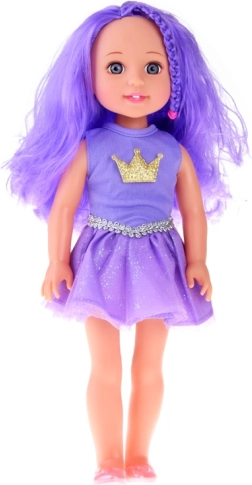 Denne dukke “Lilla dronning” imponerer med lange, bølgede lilla hår, der nemt kan redes med den medfølgende kam. Takket være bevægelige lemmer og et venligt ansigtsudtryk er den ideel til kreativ leg, udvikling af fantasi og finmotorik.