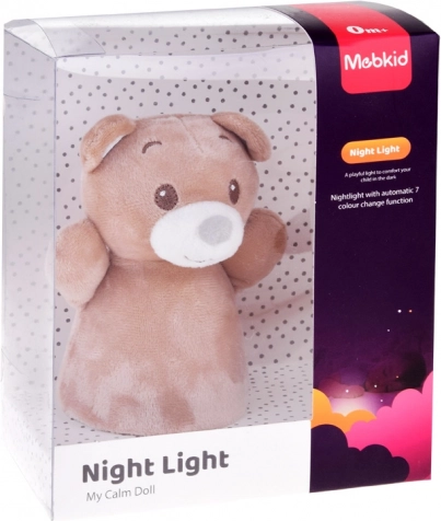Den enkle, stabile base gør det muligt at placere lampen sikkert på natbord eller hylde. Lyset skifter automatisk farver (f.eks. blå, grøn, rød, gul) og skaber en behagelig atmosfære for små børn og babyer. Plys-betrækket kan nemt tages af og rengøres.