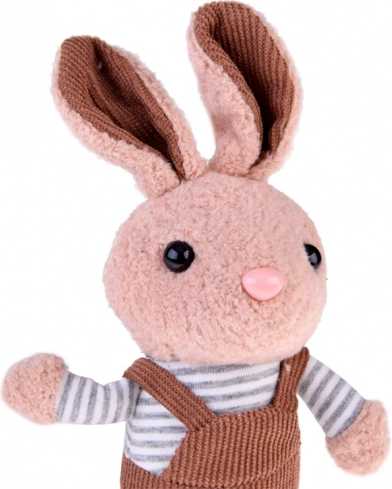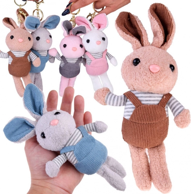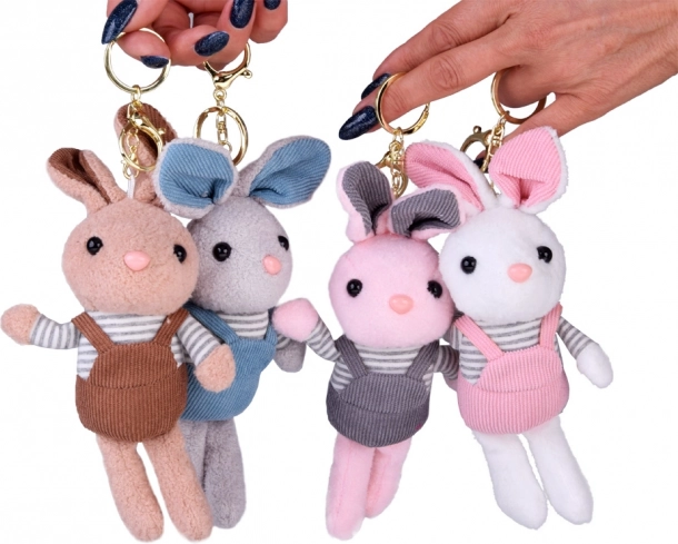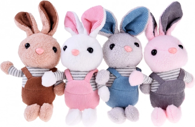 Perfekt som vedhæng til rygsæk, pynt til nøgler eller en lille krammeven i hånden på farten. Den stribede T‑shirt og overalls i forskellige farver giver kaninen en personlig stil, der tiltaler både børn og voksne.