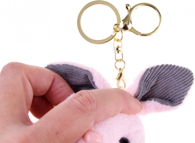 Denne charmerende plys kanin kombinerer dekorativt udtryk med praktisk anvendelighed. Den bløde krop, lange ører og fine detaljer som plastøjne og lyserød snude virker venlige og trygge. Takket være den pålidelige ring og karabinhage fastgør du den på et øjeblik.