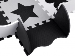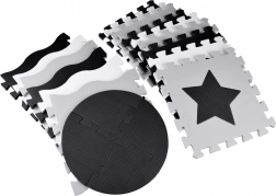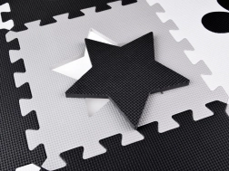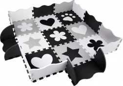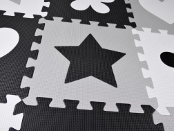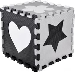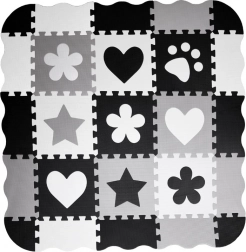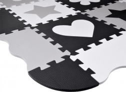 Legeunderlag af EVA-skum beskytter mod kulde fra gulvet, dæmper fald og understøtter udviklingen af fin- og grovmotorik. Det neutrale, kontrastfulde design med hjerter, stjerner og andre former passer til ethvert børneværelse og stue.