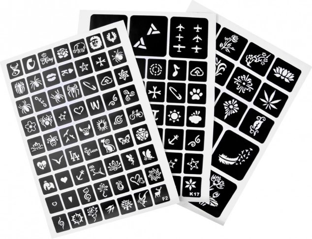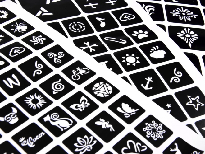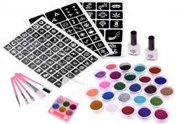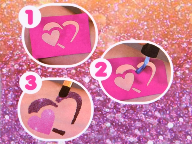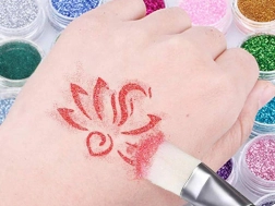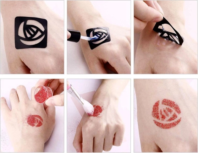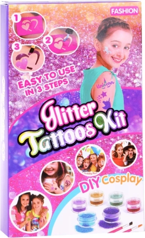 Vejledning: Vælg en skabelon og sæt den på ren hud, påfør mønsteret med lim, fjern skabelonen, tilføj glitterfarverne – og så er du færdig!