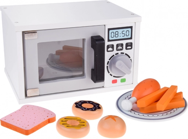 Træ mikrobølgeovn er et perfekt supplement til børnekøkkenet. Lavet af høj kvalitet træ, har det en plastikkontrolknap, der laver en rystende lyd, når den drejes. Mikrobølgeovnen har et realistisk design med hvid farve og gråsorte detaljer.
