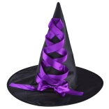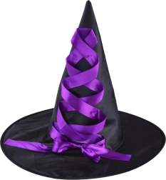 Den sorte heksehat er pyntet med et lilla satinbånd. Den faste form og den markante farvekontrast understreger det magiske look.