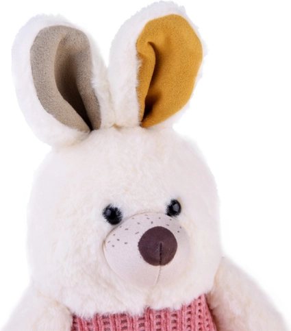 Plys-kanin er lavet af en blød, fin hvid pels, der er behagelig at røre ved. Kaninen har en lyserød mave, et øre og ben i gul farve, det andet øre og ben i grå. Den brune, plettede næse og sorte plastøjne tilføjer til dens sødhed.