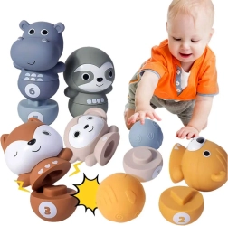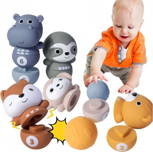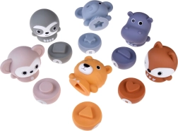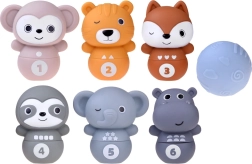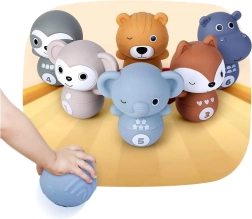 Placer keglerne ved siden af hinanden, og lad børnene vælte de glade dyr med bolden. Når de vælter, deles de i to halvdele, hvilket giver en ekstra måde at lege på. Børnene træner motorik og logisk tænkning ved at samle dyrene igen efter form og tal.