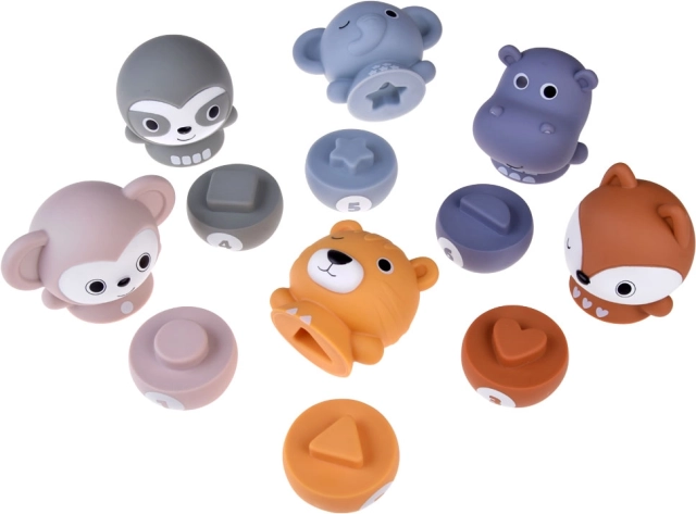 Vælg mellem seks forskellige dyrefigurer: abe, elefant, flodhest, tiger, dovendyr og egern.