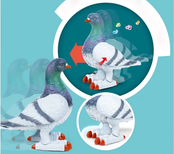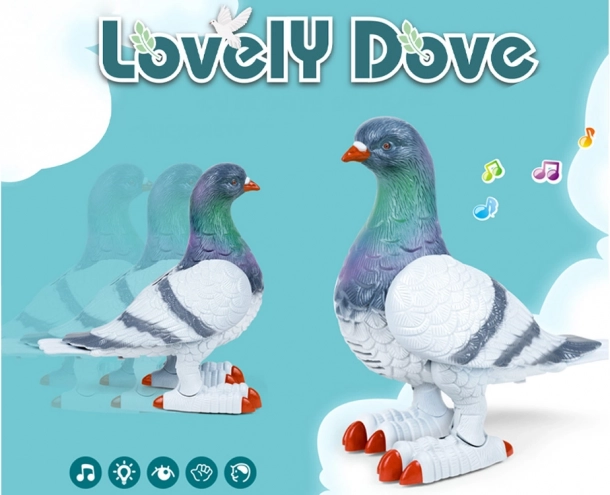 Den interaktive due kan langsomt bevæge sig fremad, flakse med vingerne og blinke med øjnene, hvilket er ledsaget af en munter melodi.