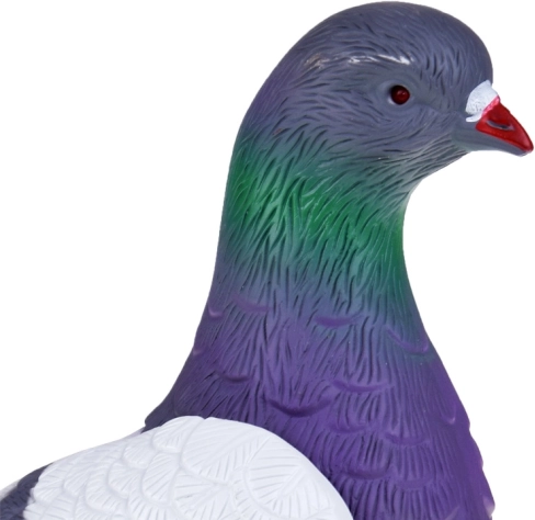 Leketøjet efterligner nøje udseendet af en rigtig due, inklusive farveovergang på hovedet og detaljerede elementer som kløer og fjer.