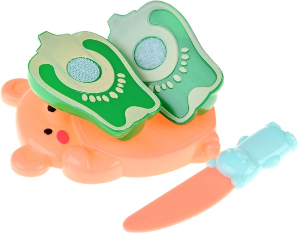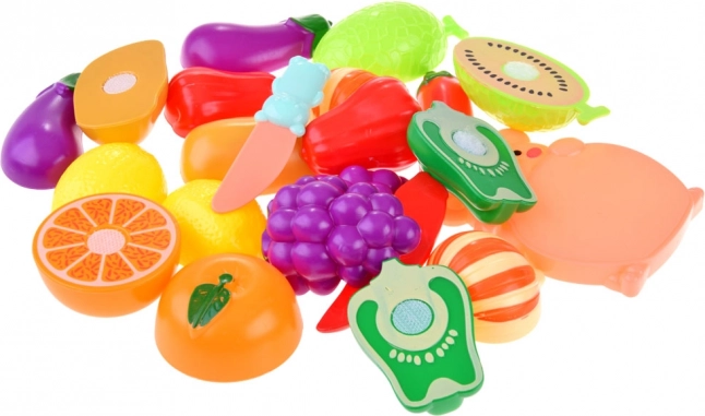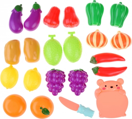 Grøntsager/frugt er også lavet af plast i attraktive farver. De sættes sammen med velcro-kroge, så barnet kan lege, at de skærer dem.
