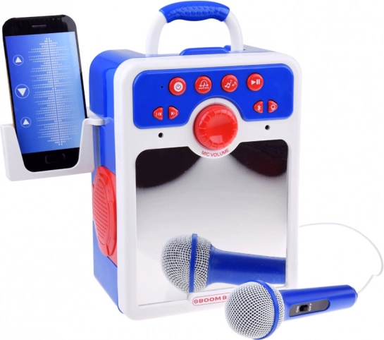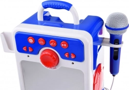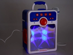 Betjeningen er enkel og sikker: stor dreieregulator til lydstyrke, On/Off-kontakt, knapper til springe over og spole numre og mulighed for at slukke lyseffekterne. Der medfølger en ledningsmikrofon med egen kontakt, som pænt forstærker barnets stemme. Praktiske udtrækkelige sideholdere rummer telefon eller MP3-afspiller, og det integrerede håndtag gør det nemt at bære.