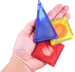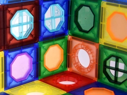 Byggesættet indeholder forskellige farverige paneler og former, som hjælper børn med at genkende former og farver.