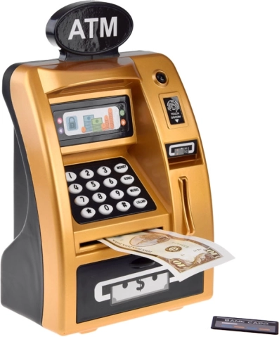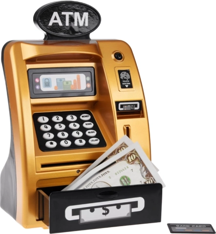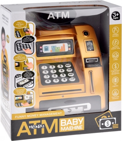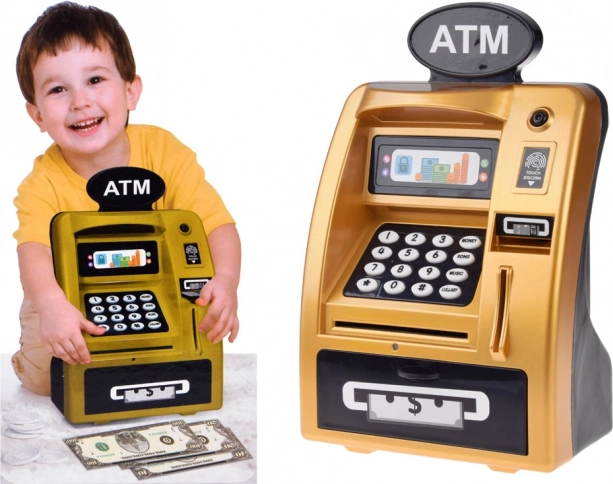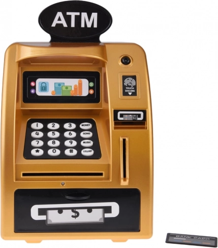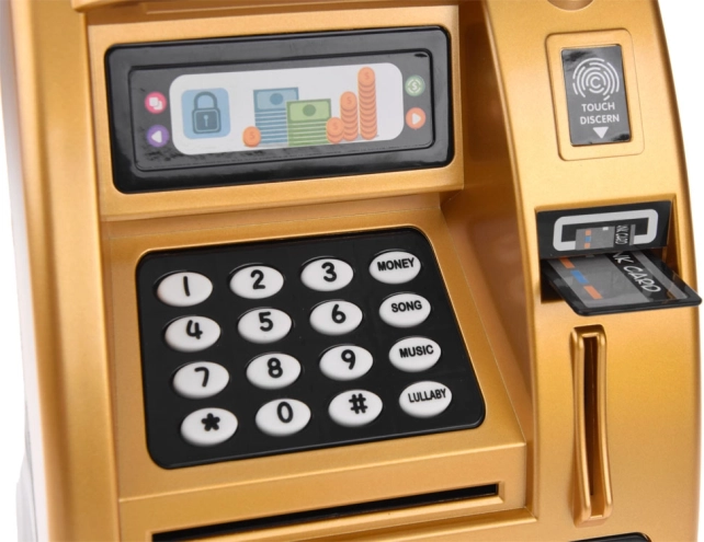 Mød den gyldne ATM, der ligner og fungerer som en ægte hæveautomat. Den er lavet af plast med et realistisk design, inklusive tastatur, digitalt display og kortslot. Ved at indsætte legekortet og indtaste PIN-koden aktiverer børn ATM’ens funktioner.