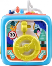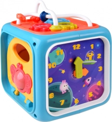 Denne multifunktionelle aktivitetskube udvikler børns færdigheder gennem leg. Børn øver manipulative evner på labyrinten med perler og tandhjul, lærer at sortere former takket være sorteren, og med uret med bevægelige visere kan de opdage dagsrytme og deres første forståelse af tid.