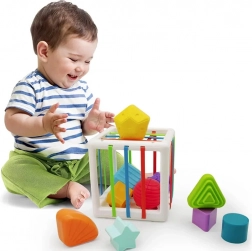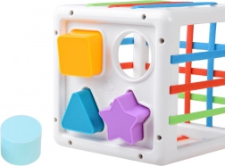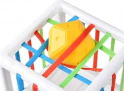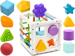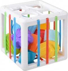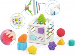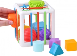Denne pædagogiske puttekasse giver masser af meningsfuld leg – læg brikker i og tag dem ud gennem farvede elastiske bånd eller via de formede åbninger. Med den brede palet af former (trekant, firkant, cirkel, stjerne, kugle, blomst, femkant m.fl.) øver børn genkendelse af former og farver og udvikler naturligt finmotorikken.