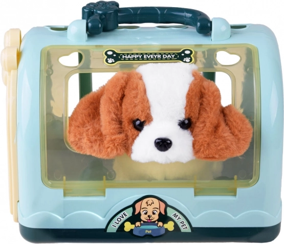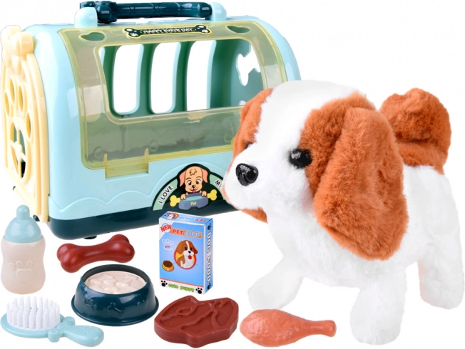 - Plyshund, bærbar transportkasse, børste, sutteflaske, skål med imitation af foder, ben, kyllingelår, steak, æske med imitation af foder, klistermærker