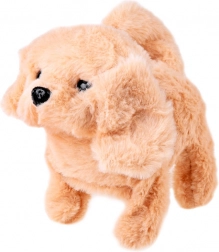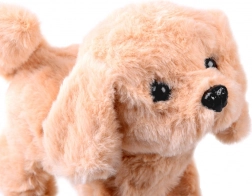 Den bløde beige hund går, gøer, vifter med halen og laver hvalpelyde, når den bliver klappet – lige som en rigtig hvalp.