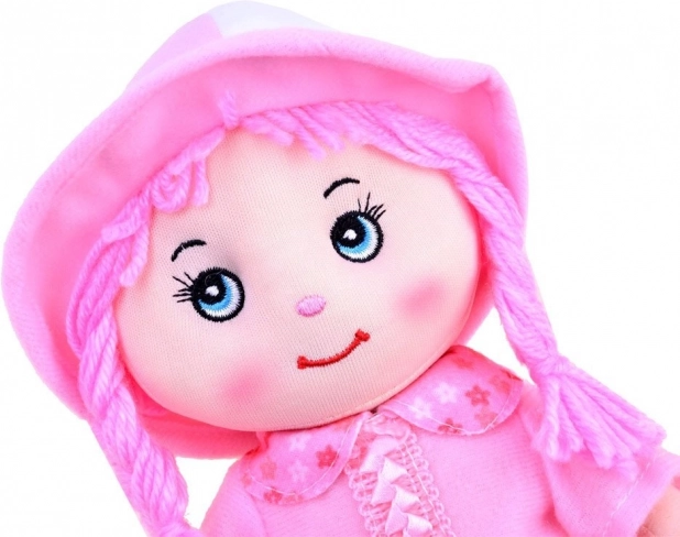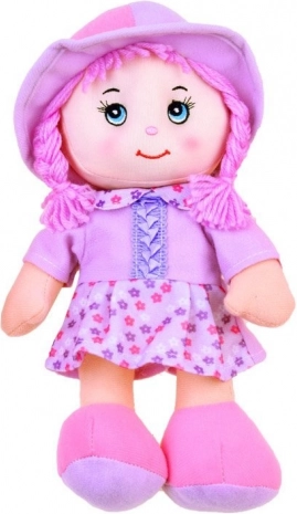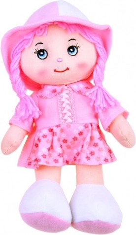 Lyserøde fletninger, lille hat og kjole med blomstertryk gør dukken til en yndig ledsager i hverdagen.