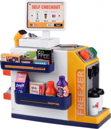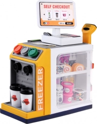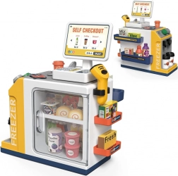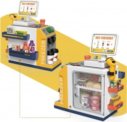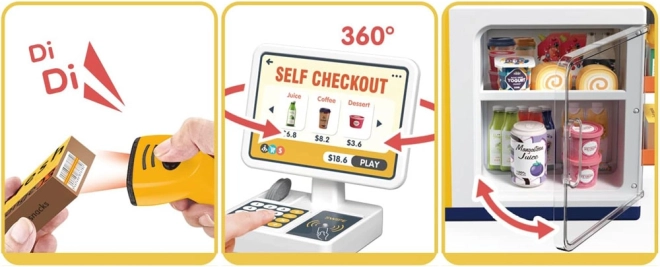 Dette realistiske selvbetjeningskasse-setup med kaffehjørne forvandler værelset til et lille supermarked. Børn prøver at betjene kunder, lave kaffe, scanne varer og betale med kort eller “kontanter”. Integreret fryser/køleskab til desserter og drikke, farvede knapper og display skaber en autentisk oplevelse.