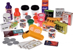 Sættet indeholder 46 omhyggeligt designede dele: kasseapparat med lyd, scanner med lys, kortlæser, kaffekopper og espressokopper, rekvisit-drikke, yogurter, is og papæsker (mælk, småkager, kaffe, sushi, pizza m.m.) samt sedler, mønter og kreditkort. Dermed udvikles kommunikation, finmotorik og finansiel forståelse.