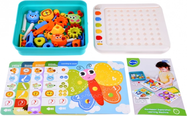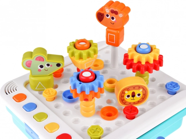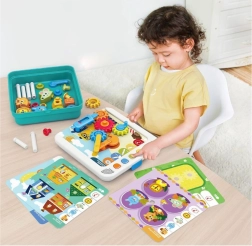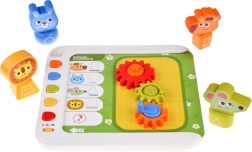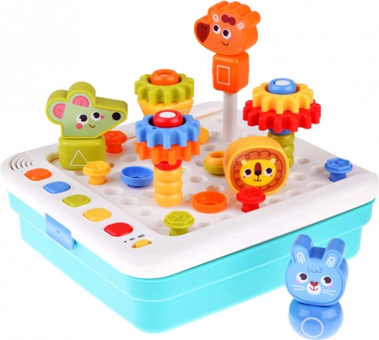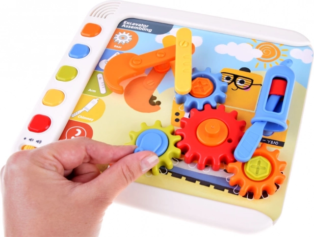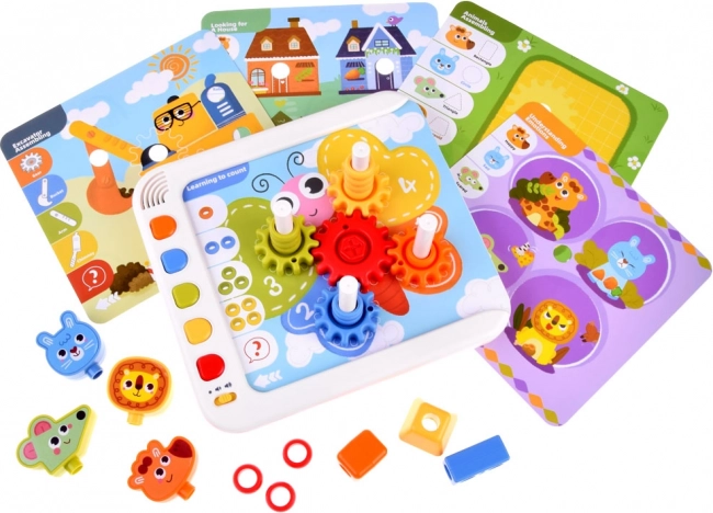 Pakken indeholder et elektronisk panel, en skuffe til brikker, 5 temakort, farvede klodser og tandhjul, dyrefigurer (giraf, kanin, mus, løve) samt en farverig illustreret lille bog. Barnet kan bygge bevægelige konstruktioner, udvikle øje–hånd-koordination og forstå mekanikken i gearoverførsel. Den røde knap på panelet starter ekstra udfordringer for endnu mere sjov.