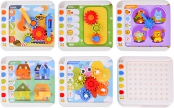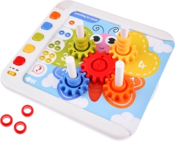 Farverige hjul og klodser udvikler finmotorik og forståelse for mekanik. Når ét hjul drejes, sættes de andre i bevægelse – sjov, der lærer årsag og virkning.