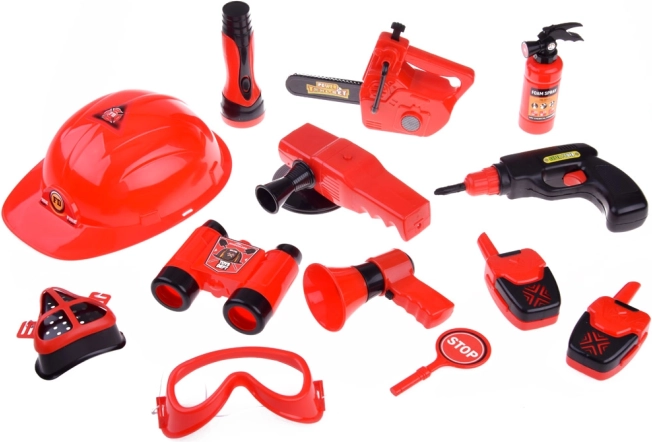 Sættet indeholder alt, hvad der er nødvendigt til brandmandsleg: hjelm, kikkert, megafon, maske og andre sikkerhedstilbehør.