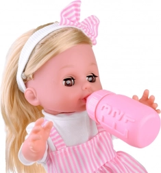 Dukken er iført smukke hvide og lyserøde kjoler med blomsterprint og en hvid t-shirt. Hun har en tissefunktion, der giver børn mulighed for at lære om babypleje. Dukken føles realistisk takket være det hårde gummi hoved, arme og ben.