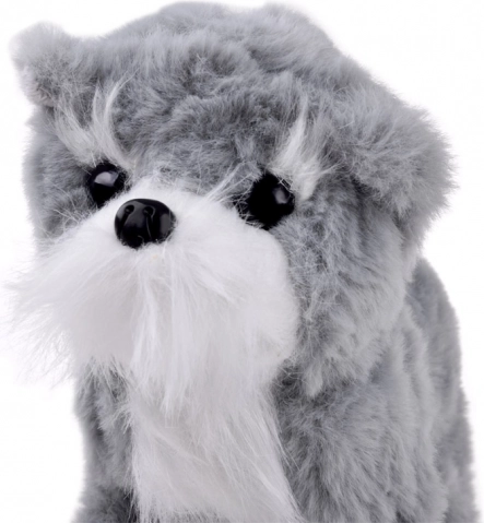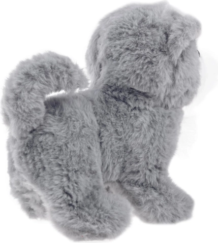 Lyse og skinnende øjne, realistisk snude og blød grå plys gør hvalpen til en fremragende ledsager både til leg og som dekoration.