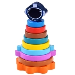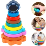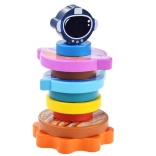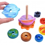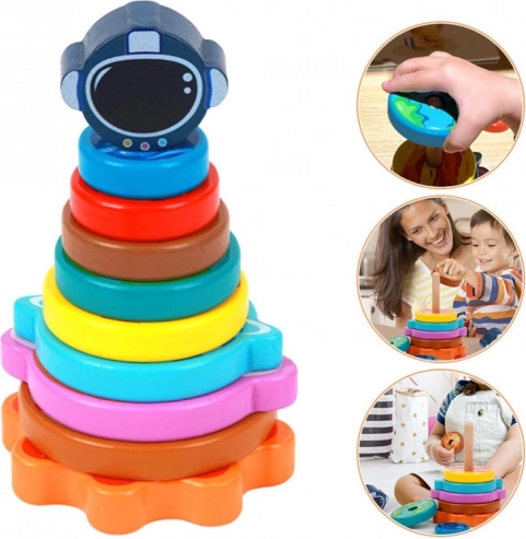 Træpuslespillet med rumtema er en ideel legetøj for børn, der elsker at opdage nye ting og forbedre deres manuelle færdigheder. Med dette puslespil lærer børnene at arrangere brikkerne efter størrelse fra den største til den mindste, mens toppen er en brik formet som en astronauthjelm.