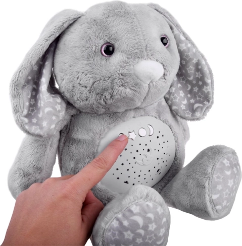 Den bløde plyskanin er lavet af blødt materiale i en dæmpet grå farve, dekoreret med stjerne- og månemønstre på ører og fødder. Øjnene er lavet af plast, mens næsen er broderet, hvilket giver legetøjet et sødt udseende. Takket være det interaktive panel placeret i kaninens mave bliver det en uundværlig ledsager for børn, der har svært ved at falde i søvn alene.
