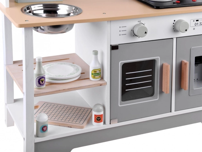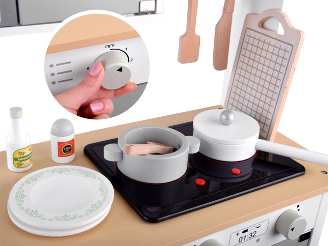 Træ interaktivt køkken er et ideelt værktøj til at udvikle dine børns kreativitet og motoriske færdigheder. Dette børnesæt efterligner daglige aktiviteter, fremmer imaginativ leg og er fuldstændig lavet af naturligt træ, hvilket sikrer sikkerhed og holdbarhed.