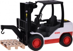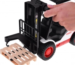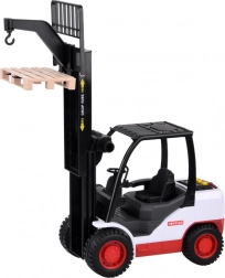 Sættet inkluderer gaffeltruck og palle, hvilket giver børn mulighed for at lege bygge- og logistikoperationer. Trucken har gummihjul for nem bevægelse og justerbar løftemekanisme, som kan kontrolleres med en håndsving.