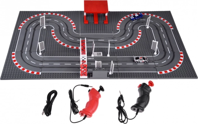 De to håndkontroller med trinløs hastighedsregulering tilsluttes stationen på banen og giver præcis styring i svingene såvel som på langsiderne. Takket være strøm via USB behøver du ingen batterier – det er bare at tilslutte og køre. I pakken finder du alt til en hurtig start: