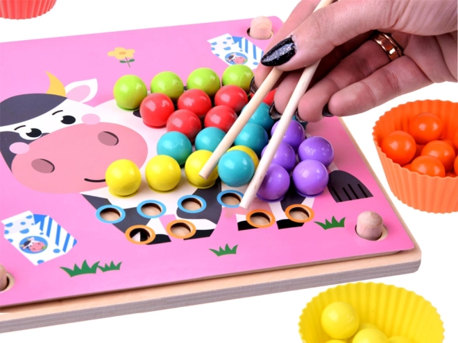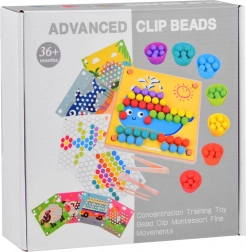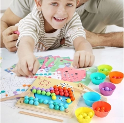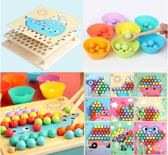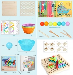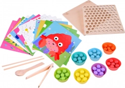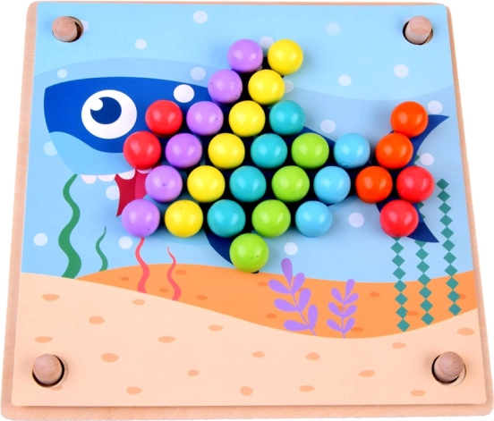 Denne træmosaik indeholder 77 farvede kugler i 7 farver, en todelt træplade og et rigt tilbehørssæt inklusive silikoneskåle, pincet, spisepinde og ske. Børn kan lægge motiver fra 10 temaskabeloner (fx krabbe, blæksprutte, haj, rokke, hval, hane, får, ko, dinosaurus, bus) og 5 skabeloner til mønstre – eller skabe efter egen fantasi.