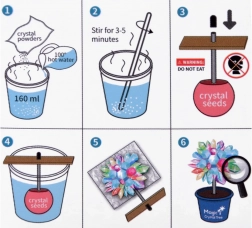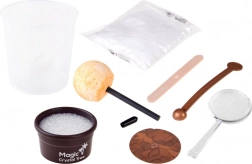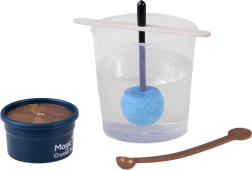 I sættet finder du alt, hvad du behøver: et 200 ml målebæger, en pose med krystalpulver/sand, et farvet krystalfrø på pind, et omrører, en lup til detaljeret observation, en træplade, en stopper og en lille urtepotte (fod). Proceduren er enkel og sikker – følg blot vejledningen og arbejd med varmt vand under en voksens opsyn.