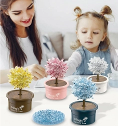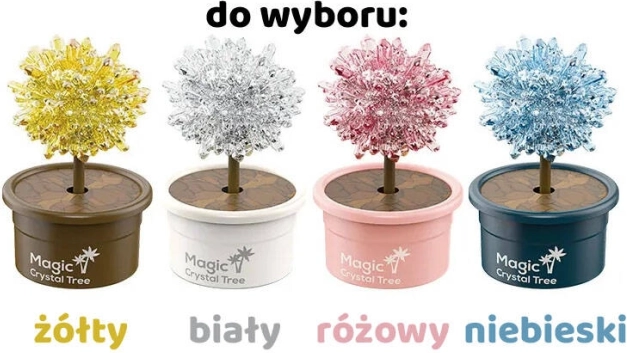 Forskellige farvevarianter af krystaltræer forvandler eksperimentet til en smuk dekoration. Hvis der ikke vælges en bestemt nuance, sendes farven tilfældigt.