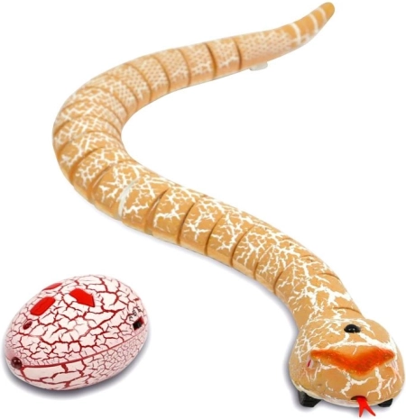 Den fjernstyrede slange efterligner en ægte reptiles bevægelser – den snoer sig, rækker tungen ud og vipper med halen, så den virker meget overbevisende. Den æggeformede fjernbetjening er intuitiv, og den kompakte størrelse gør den behagelig at holde, også for mindre børn.