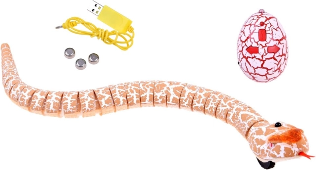 Den indbyggede batteripakke i slangen oplades via USB, så du slipper for at købe batterier. Fjernbetjeningen drives af almindeligt tilgængelige knapcellebatterier AG13. Hele sættet er pakket i en gaveæske af karton, som beskytter legetøjet under transport.
