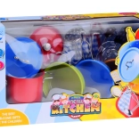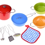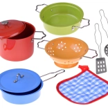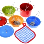 Farverigt metalsæt til små kokke, der giver en realistisk madlavningsleg. Indeholder gryder, pande, sien og redskaber og er ideelt til at udvikle fantasi, finmotorik og rolleleg i børnekøkkenet.